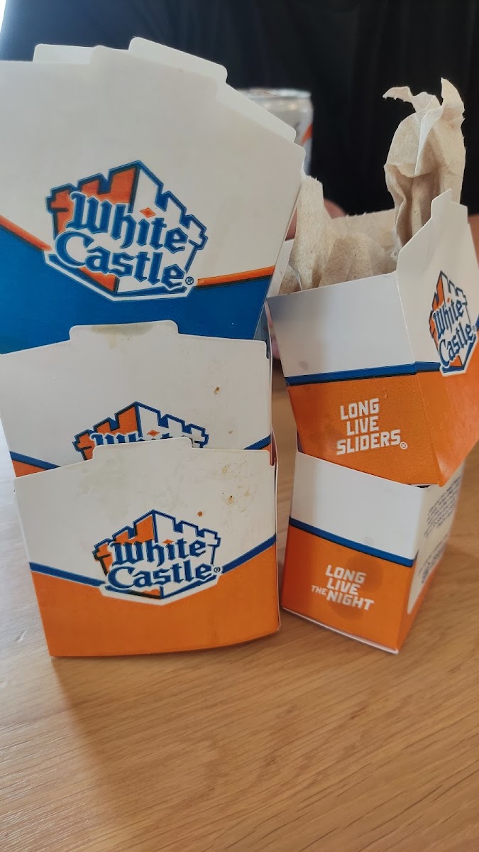 Me the mother and the 2 kids, brother and sister.All for one to White Castle, Tuesday night after they coming from tomo park, the kids were swimming in the sprinkler water afterwards.We went to white castles, got white castles.It was good!